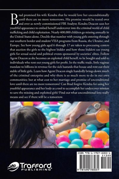 Brad promised his wife Kendra that he would love her unconditionally until there are no more tomorrows. His promise would be tested over and over as newly commissioned FBI analyst Kendra Deacon uses her youthful appearance to embed herself undercover into the criminal world of child trafficking and child exploitation, but at what cost to her marriage and promise of unconditional love until there are no more tomorrows? Can Brad forgive Kendra for using her youthful appearance and her body as a tool to accomplish her undercover mission to save the missing and exploited girls? Find out what unconditional love really means and see if there will be a tomorrow.