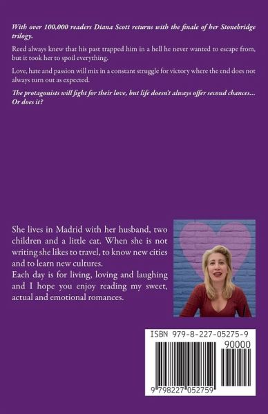 With over 100,000 readers Diana Scott returns with the finale of her Stonebridge trilogy. Reed always knew that his past trapped him in a hell he never wanted to escape from, but it took her to spoil everything. Love, hate and passion will mix in a constant struggle for victory where the end does not always turn out as expected. The protagonists will fight for their love, but life doesn't always offer second chances... Or does it? Some of its readers say: "I recommend her, she is great, from the beginning you can't stop reading, her books have everything: suspense, love, laughter, tears, simply spectacular." "All her books are wonderful, they grab you from minute one". "Of course I recommend her, her stories hook you from the beginning, she makes you want to be her protagonist and above all her narrative is enjoyable, the details make you understand and comprehend the characters, she entertains you and they are not heavy." "Nothing that can be told... You have to read it for yourself and you will enter the novels as if you were the main character. Simply perfect.