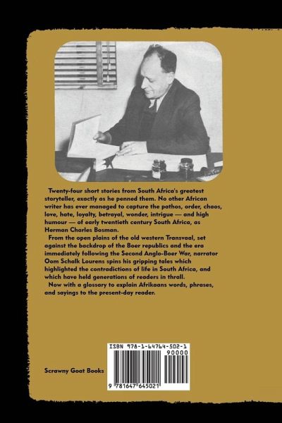 Twenty-four short stories from South Africa's greatest storyteller, exactly as he penned them. No other African writer has ever managed to capture the pathos, order, chaos, love, hate, loyalty, betrayal, wonder, intrigue - and high humour - of early twentieth century South Africa, as Herman Charles Bosman. From the open plains of the old western Transvaal, set against the backdrop of the Boer republics and the era immediately following the Second Anglo-Boer War, narrator Oom Schalk Lourens spins his gripping tales which highlighted the contradictions of life in South Africa, and which have held generations of readers in thrall. Now with a glossary to explain Afrikaans words, phrases, and sayings to the present-day reader.