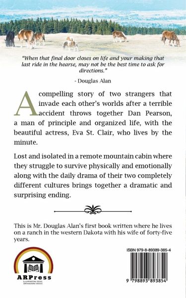 A compelling story of two strangers that invade each other's worlds after a terrible accident throws together Dan Pearson, a man of principle and organized life, with the beautiful actress, Eva St. Clair, who lives by the minute. Lost and isolated in a remote mountain cabin where they struggle to survive physically and emotionally along with the daily drama of their two completely different cultures brings together a dramatic and surprising ending.