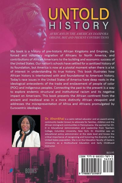 UNTOLD HISTORY illustrates how African history is intertwined with and foundational to American history. The book begins this narrative in the fourteenth century, when European seafarers discovered the coastal regions of Africa, describes the meeting of the three worlds aEUR" Europe, Africa, and the New World, (later known as America), and details the increasing interactions of the three worlds after the 1450s. The author dispels some of the misconceptions about pre-colonial Africa by presenting the history and culture of the African continent from a distinctively African lens. As such, this book chronicles some prominent African empires and kingdoms, Africa-European bilateral trade relations, the trans-Atlantic Slave trade, and contemporary Africans in the United States. The book highlights stories of contemporary Africans residing in the United States and documents the contributions of early and contemporary Africans to the history, economic development, culture, and prominence of the United States of America. It concludes with a snapshot of contemporary Africa. The book provides a framework for understanding the history of Africa prior to the arrival of European merchants on its shores, African civilizations, cultures, legacy, and contributions to American. Educators can use the book to supplement their course on American History, World History, African American History in pre-collegiate or collegiate settings. This book can help educators to reimagine the teaching and learning of the United States history by centering on important narratives in Africa and with Africans in the American diaspora. The book is organized chronologically and can help the reader to understand the past as it relates to the present world. To facilitate teaching, each chapter opens with a quotation that introduces the content of the chapter and ends with study discussion questions that educators can use or adapt as appropriate for instruction and to ensure full, comprehensive understanding of the content presented.