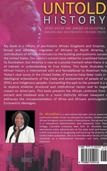 UNTOLD HISTORY illustrates how African history is intertwined with and foundational to American history. The book begins this narrative in the fourteenth century, when European seafarers discovered the coastal regions of Africa, describes the meeting of the three worlds aEUR" Europe, Africa, and the New World, (later known as America), and details the increasing interactions of the three worlds after the 1450s. The author dispels some of the misconceptions about pre-colonial Africa by presenting the history and culture of the African continent from a distinctively African lens. As such, this book chronicles some prominent African empires and kingdoms, Africa-European bilateral trade relations, the trans-Atlantic Slave trade, and contemporary Africans in the United States. The book highlights stories of contemporary Africans residing in the United States and documents the contributions of early and contemporary Africans to the history, economic development, culture, and prominence of the United States of America. It concludes with a snapshot of contemporary Africa. The book provides a framework for understanding the history of Africa prior to the arrival of European merchants on its shores, African civilizations, cultures, legacy, and contributions to American. Educators can use the book to supplement their course on American History, World History, African American History in pre-collegiate or collegiate settings. This book can help educators to reimagine the teaching and learning of the United States history by centering on important narratives in Africa and with Africans in the American diaspora. The book is organized chronologically and can help the reader to understand the past as it relates to the present world. To facilitate teaching, each chapter opens with a quotation that introduces the content of the chapter and ends with study discussion questions that educators can use or adapt as appropriate for instruction and to ensure full, comprehensive understanding of the content presented.