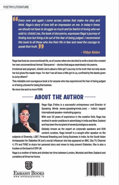 This book is a collection of stories and poems that were the key to creating a complete person. Some broken, some healed, some in the process of healing. Raga has lived an unconventional life, so of course when she decided to write a book she created her own unconventional format 'Storyoems' - stories that segue seamlessly into poems. Emotional and poignant, Untold Lies is about a little girl's journey to the truth that not only saves her but gives the reader hope. For don't we all have a little girl in us, confined by the labels given to us by others? This relatable and courageous book is for anyone who has experienced the fear of being judged or of being unloved for being themselves. The poems express the various emotions that one goes through in life. There are many observational poems on everyday life. There are poems on heartbreak, the pain of the broken pieces and the hurt that lingers on. However, each poem is full of hope and that is what I would like to leave with the readers.