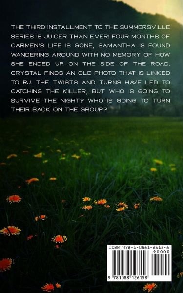The third installment to the Summersville series is juicer than ever! Four months of Carmen's life is gone, Samantha is found wandering around with no memory of of how she ended up on the side of the road. Crystal finds an old photo that is linked to RJ. The twists and turns have led to catching the killer, but who is going to survive the night? Who is going to turn their back on the group?