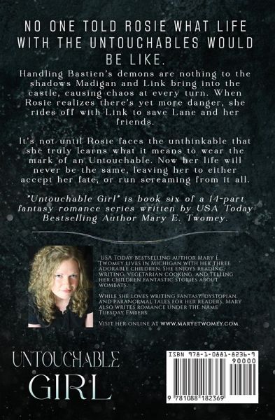 No one told Rosie what life with the Untouchables would be like. Handling Bastien's demons are nothing to the shadows Madigan and Link bring into the castle, causing chaos at every turn. When Rosie realizes there's yet more danger, she rides off with Link to save Lane and her friends. It's not until Rosie faces the unthinkable that she truly learns what it means to wear the mark of an Untouchable. Now her life will never be the same, leaving her to either accept her fate, or run screaming from it all. "Untouchable Girl" is book six of a 14-part fantasy romance series written by USA Today Bestselling Author Mary E. Twomey.