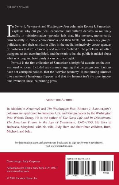 "In Untruth, Newsweek and Washington Post columnist Robert J. Samuelson explains why our political, economic and cultural debates so routinely traffic in misinformation--popular fads that, like meteors, momentarily burn brightly in public consciousness and then fizzle out. They are discredited by time, experience and (occasionally) reason and logic. The prevalence of dubious political and intellectual fashions, Samuelson argues, stems from the triumph of ""problem-solving politics."" Advocacy groups, politicians and their unwitting allies in the media instinctively create agendas of problems that afflict society and must somehow be solved. The process of merchandising these ideas inevitably results in exaggeration and simplification. Samuelson calls this process ""untruth,"" because it is (usually) not the consequence of deliberate lies or even conscious conspiracies. The result is the same: the public is misled about what is wrong and how easily it can be made right. Untruth collects some of Samuelson's most enduring assaults on the conventional wisdom. These include columns arguing that campaign contributions have not corrupted politics, that the ""service economy"" is not turning America into a nation of hamburger flippers, that political gridlock is good (at least better than the alternatives) and that the Internet isn't the most important invention since the printing press."