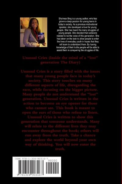 Unusual Cries (Inside the mind of a "lost" generation) The Diary Unusual Cries is a story filled with the issues that many young people face in today's society. This story touches on many different aspects of life disregarding the race, but focusing on the bigger picture. Many people do not understand the "lost" generation. Unusual Cries is written in the action to become an eye opener for those who cannot see. This book is meant to open the ears of those who refuse to listen. Unusual Cries is written to show this generation that someone understands. Many will relate to the different lives they may encounter throughout the book, others will run away from the truth. Take a chance and explore the world beyond your own way of thinking. You will now enter the truth.