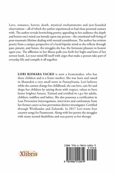 Love, romance, horror, death, mystical enchantments and just-founded observationsall of which the author experienced or had close personal contact with. The author reveals bewitching poetry, appealing to her audience the depth and horror ones mind can intrude upon one personthe emotional well-being of post-traumatic lifetime dealing with mental unstableness. The author has written poetry from a unique perspective of a lucid bipolar mind as she reflects through past, present, and future, the struggles she has, the fortunate pleasure to bestow upon you. The affliction to her illness pulls you forth her highs and lows of her newest book. Let your mind fill itself with urges that make a person take part of everyday life and compile it all together.