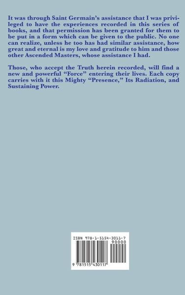 IT WAS through Saint Germain's assistance that I was privileged to have the experiences recorded in this series of books, and that permission has been granted for them to be put in a form which can be given to the public. No one can realize, unless he too has had similar assistance, how great and eternal is my love and gratitude to him and those other Ascended Masters, whose assistance I had. Those, who accept the Truth herein recorded, will find a new and powerful "Force" entering their lives.