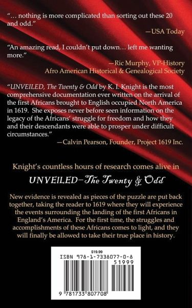 2019 PHILLIS WHEATLEY LITERARY AWARD WINNER - SONS AND DAUGHTERS OF THE US MIDDLE PASSAGE 2019 Florida Authors & Publishers President's Book Awards Winner - BEST NON-FICTION (Gold), BEST REFERENCE/RESEARCH - (Silver) 2020 Independent Publisher Book Awards Winner - BEST REFERENCE (Silver) UNVEILED - The Twenty & Odd reveals the true story behind the landing of the first Africans in England's America, in 1619 and 1620, removing a 400-year-old political veil of corruption. For the first time, America will have a new understanding of who these first Africans were, from where they came, the struggles they faced, and the amazing achievements they made. Knight's countless hours of research comes alive as pieces of the puzzle are put back together taking the reader to the infancy of America where they will experience a story buried deep in turmoil and deceit with the many variable parts assembled long ago to hoodwink the councils and courts and allow a powerful earl to retain his head. Now, Unveiled - The Twenty & Odd sheds new light on the first Africans, finally allowing them to take their true place in history.