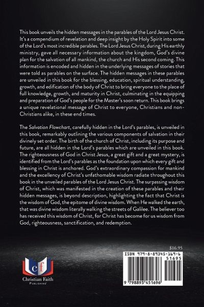 This book unveils the hidden messages in the parables of the Lord Jesus Christ. It's a compendium of revelation and deep insight by the Holy Spirit into some of the Lord's most incredible parables. The Lord Jesus Christ, during His earthly ministry, gave all necessary information about the kingdom, God's divine plan for the salvation of all mankind, the church and His second coming. This information is encoded and hidden in the underlying messages of stories that were told as parables on the surface. The hidden messages in these parables are unveiled in this book for the blessing, education, spiritual understanding, growth, and edification of the body of Christ to bring everyone to the place of full knowledge, growth, and maturity in Christ, culminating in the equipping and preparation of God's people for the Master's soon return. This book brings a unique revelational message of Christ to everyone, Christians and non-Christians alike, in these end times. The Salvation Flowchart, carefully hidden in the Lord's parables, is unveiled in this book, remarkably outlining the various components of salvation in their divinely set order. The birth of the church of Christ, including its purpose and future, are all hidden in the Lord's parables which are unveiled in this book. The righteousness of God in Christ Jesus, a great gift and a great mystery, is identified from the Lord's parables as the foundation upon which every gift and blessing in Christ is anchored. God's extraordinary compassion for mankind and the excellency of Christ's unfathomable wisdom radiate throughout this book in the unveiled parables of the Lord Jesus Christ. The surpassing wisdom of Christ, which was manifested in the creation of these parables and their hidden messages, is beyond description, highlighting the fact that Christ is the wisdom of God, the epitome of divine wisdom. When He walked the earth, that was divine wisdom literally walking the streets of Galilee. The believer too has received this wisdom of Christ, for Christ has become for us wisdom from God, righteousness, sanctification, and redemption.
