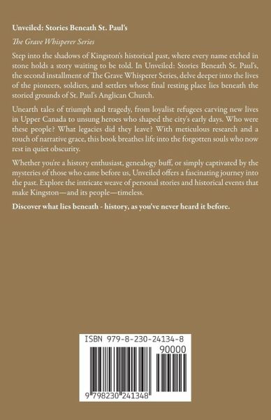 Unveiled: Stories Beneath St. Paul's The Grave Whisperer Series Step into the shadows of Kingston's historical past, where every name etched in stone holds a story waiting to be told. In Unveiled: Stories Beneath St. Paul's, the second installment of The Grave Whisperer Series, delve deeper into the lives of the pioneers, soldiers, and settlers whose final resting place lies beneath the storied grounds of St. Paul's Anglican Church. Unearth tales of triumph and tragedy, from loyalist refugees carving new lives in Upper Canada to unsung heroes who shaped the city's early days. Who were these people? What legacies did they leave? With meticulous research and a touch of narrative grace, this book breathes life into the forgotten souls who now rest in quiet obscurity. Whether you're a history enthusiast, genealogy buff, or simply captivated by the mysteries of those who came before us, Unveiled offers a fascinating journey into the past. Explore the intricate weave of personal stories and historical events that make Kingston-and its people-timeless. Discover what lies beneath - history, as you've never heard it before.