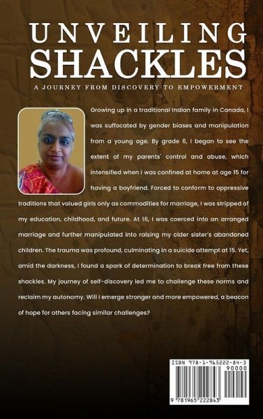 Growing up in a traditional Indian family in Canada, I felt suffocated by gender biases and oppression from a young age. My parents' manipulation and control took its toll on me, forcing me to conform to societal expectations. In grade 6, I began to realize the extent of their abuse, manipulation, and gender biases. By age 15, my parents placed me under home confinement for daring to have a boyfriend. They eventually forced me to comply with traditional expectations for Indian girls. These expectations were rooted in ancient Indian traditions and philosophy, which viewed girls as mere commodities to be married off at a young age to maintain their purity and avoid negative behaviors. Girls were not considered worthy of the same rights as boys, as they were deemed of no value. The manipulation and control had already taken a significant toll on my life, but the final blow was devastating- I attempted suicide at age 15. I thought things could not get worse; I was forced into a traditional Indian arranged marriage at 16 years old. As a teenager, I was robbed of my right to education, my childhood, and my future. My parents coerced and manipulated my husband and me into raising my older sister Rani's abandoned babies. The trauma of this experience left deep scars but also fueled my determination to break free from the shackles of societal norms and reclaim my autonomy. As I navigated this treacherous landscape, I discovered that the traditions meant to guide me were a way to manipulate and control me. Through my journey of self-discovery, I found the courage to challenge these norms and reclaim my power. Will I emerge stronger, wiser, and more empowered than ever before? Will I emerge from this darkness as a beacon of hope? inspiring others who have faced similar challenges?