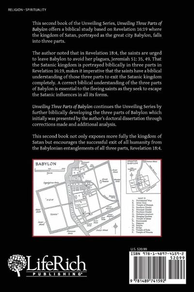 This second book of the Unveiling Series, Unveiling Three Parts of Babylon, by Dr. William C. Taggart III, offers a biblical study based on Revelation 16:19 where the kingdom of Satan, portrayed as the great city Babylon, falls into three parts. The author noted that in Revelation 18:4, the saints are urged to leave Babylon to avoid her plagues, Jeremiah 51: 35, 49. That the Satanic kingdom is portrayed biblically in three parts in Revelation 16:19, makes it imperative that the saints have a biblical understanding of those three parts to exit the Satanic kingdom completely. A correct biblical understanding of the three parts of Babylon is essential to the fleeing saints as they seek to escape the Satanic influences in all its forms. Unveiling Three Parts of Babylon continues the Unveiling Series by further biblically developing the three parts of Babylon which initially was presented by the author's doctoral dissertation through corrections made and additional analysis. This second book not only exposes more fully the kingdom of Satan but encourages the successful exit of all humanity from the Babylonian entanglements of all three parts, Revelation 18:4.