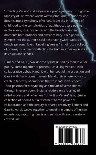 "Unveiling Verses" invites you on a poetic journey through the tapestry of life, where words weave emotions, memories, and dreams into a symphony of verses. From the innocence of childhood to the complexities of adulthood, these poems explore love, loss, resilience, and the beauty found in moments both ordinary and extraordinary. Each poem is a glimpse into the author's soul, resonating with readers on a deeply personal level. "Unveiling Verses" is not just a collection of poems; it's a mirror reflecting the human experience in all its colors and shades.