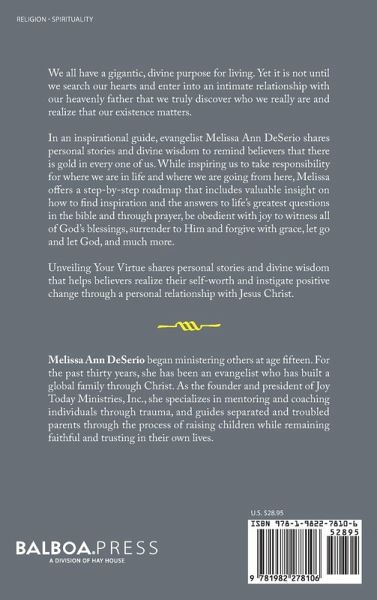 We all have a gigantic, divine purpose for living. Yet it is not until we search our hearts and enter into an intimate relationship with our heavenly father that we truly discover who we really are and realize that our existence matters. In an inspirational guide, evangelist Melissa Ann DeSerio shares personal stories and divine wisdom to remind believers that there is gold in every one of us. While inspiring us to take responsibility for where we are in life and where we are going from here, Melissa offers a step-by-step roadmap that includes valuable insight on how to find inspiration and the answers to life's greatest questions in the bible and through prayer, be obedient with joy to witness all of God's blessings, surrender to Him and forgive with grace, let go and let God, and much more. Unveiling Your Virtue shares personal stories and divine wisdom that helps believers realize their self-worth and instigate positive change through a personal relationship with Jesus Christ.
