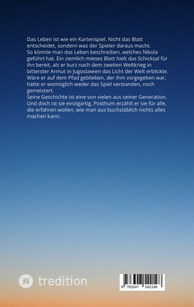 Als mein Vater einen seiner unzähligen Krankenhausaufenthalte hatte, kam ihm die Idee, sein Leben einmal aufschreiben zu wollen. Man muss dazu sagen, dass er vieles war, aber kein Leser und erst recht kein Schreiber. Trotzdem hat er Stift und Papier in die Hand genommen und drauf losgeschrieben.Rausgekommen ist dieses Werk aus Nostalgie, Unterhaltung und Inspiration. Es handelt von seiner Kindheit in größter Armut, seinen schwierigen Anfängen im Beruf und in Deutschland, von seinen komplexen Erfahrungen mit Job und Familie und schließlich seinem (Un)Ruhestand.Der Autor beschreibt in Vor- und…mehr