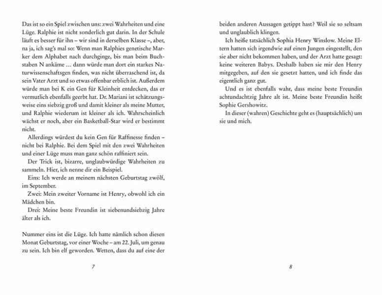 Sophie liebt ihre Nachbarin und beste Freundin Sophie heiß und innig. Ganz egal, dass zwischen ihnen 77 Jahre Altersunterschied liegen! Denn Sophie mag dieselben Dinge wie sie, unter anderem und in keiner bestimmten Reihenfolge: Bananenbrot, clevere Wortspiele, Peter und der Wolf und Teekränzchen. In letzter Zeit macht sich Sophie aber Sorgen um ihre Freundin. Denn die ältere Sophie hat Gedächtnisprobleme. Sie vergisst den Kessel auf dem Herd oder welcher Wochentag ist. Alles nicht so schlimm! Schlimm ist jedoch, dass Sophies Sohn sie in ein Heim schicken will. Die jüngere Sophie kann das nicht zulassen, das wäre Entführung! Zusammen mit ihrem zweiten und dritten besten Freunden Ralphie und Oliver hilft sie dem Gedächtnis ihrer besten Freundin auf die Sprünge. Dabei erfährt sie überaus Kostbares, Wunderbares und Trauriges über Sophie. Geschichten, die sie wie einen Schatz hüten wird - für immer.