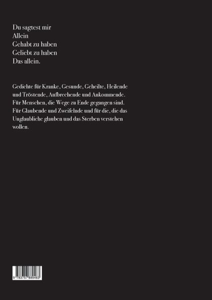 Gedichte für Kranke, Gesunde, Geheilte, Heilende und Tröstende, Aufbrechende und Ankommende. Für Menschen, die Wege zu Ende gegangen sind. Für Glaubende und Zweifelnde und für die, die das Unglaubliche glauben und das Sterben verstehen wollen.
