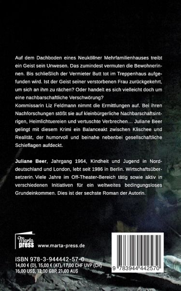 Auf dem Dachboden eines Neuköllner Mehrfamilienhauses treibt ein Geist sein Unwesen. Das zumindest vermuten die Bewohnerinnen. Bis schließlich der Vermieter Butt tot im Treppenhaus aufgefunden wird. Ist der Geist seiner verstorbenen Frau zurückgekehrt, um sich an ihm zu rächen? Oder handelt es sich vielleicht doch um eine nachbarschaftliche Verschwörung? Kommissarin Liz Feldmann nimmt die Ermittlungen auf. Bei ihren Nachforschungen stößt sie auf kleinbürgerliche Nachbarschaftsintrigen, Heimlichtuereien und vertuschte Verbrechen... Juliane Beer gelingt mit diesem Krimi ein Balanceakt zwischen Klischee und Realität, der humorvoll und beinahe nebenbei gesellschaftliche Schieflagen aufdeckt.