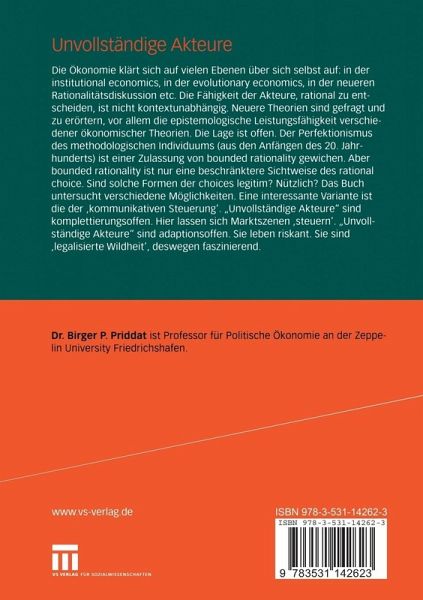 Die Ökonomie klärt sich auf vielen Ebenen über sich selbst auf: in der institutional economcis, in der evolutionary economics, in der neueren Rationalitätsdiskussion etc. Die Fähigkeit der Akteure, rational zu entscheiden, ist nicht kontextunabhängig. Neuere Theorien sind gefragt und zu erörtern, vor allem die epistemologische Leistungsfähigkeit verschiedener ökonomischer Theorien. Die Lage ist offen. Der Perfektionismus des methodologischen Individuums (aus den Anfängen des 20. Jahrhunderts) ist einer Zulassung von bounded rationality gewichen. Aber bounded rationality ist nur eine beschränktere Sichtweise des rational choice. Sind solche Formen der choices legitim? nützlich? Das Buch untersucht verschiedene Möglichkeiten. Eine interessante Variante ist die der 'kommunikativen Steuerung'. 'Unvollständige Akteure' sind komplettierungsoffen. Hier lassen sich Marktszenen 'steuern'. 'Unvollständige Akteure' sind adaptionsoffen. Sie leben riskant. Sie sind 'legalisierte Wildheit', deswegen faszinierend.
