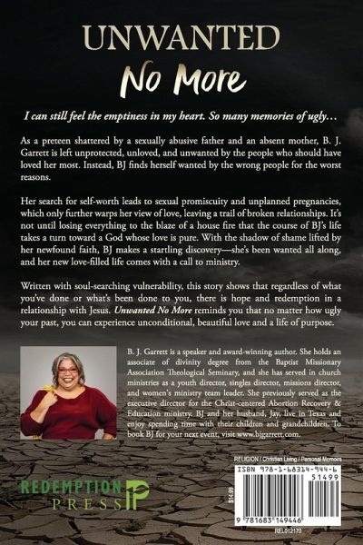 I can still feel the emptiness in my heart. So many memories of ugly… As a preteen shattered by a sexually abusive father and an absent mother, B. J. Garrett is left unprotected, unloved, and unwanted by the people who should have loved her most. Instead, BJ finds herself wanted by the wrong people for the worst reasons. Her search for self-worth leads to sexual promiscuity and unplanned pregnancies, which only further warps her view of love, leaving a trail of broken relationships. It’s not until losing everything to the blaze of a house fire that the course of BJ’s life takes a turn toward a God whose love is pure. With the shadow of shame lifted by her newfound faith, BJ makes a startling discovery—she’s been wanted all along, and her new love-filled life comes with a call to ministry. Written with soul-searching vulnerability, this story shows that regardless of what you’ve done or what’s been done to you, there is hope and redemption in a relationship with Jesus. Unwanted No More reminds you that no matter how ugly your past, you can experience unconditional, beautiful love and a life of purpose.