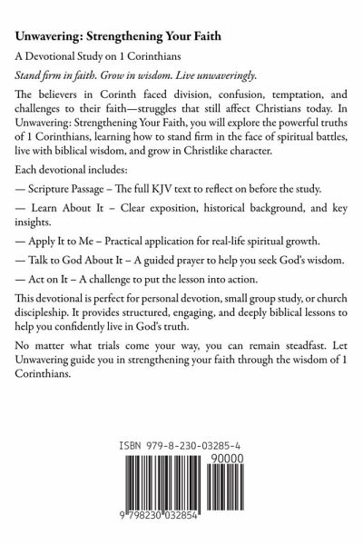 Unwavering: Strengthening Your Faith A Devotional Study on 1 Corinthians Stand firm in faith. Grow in wisdom. Live unwavering. The believers in Corinth faced division, confusion, temptation, and challenges to their faith-struggles that still affect Christians today. In Unwavering: Strengthening Your Faith, you will explore the powerful truths of 1 Corinthians, learning how to stand firm in the face of spiritual battles, live with biblical wisdom, and grow in Christlike character. Each devotional includes: ¿ Scripture Passage - The full KJV text to reflect on before the study. ¿ Learn About It - Clear exposition, historical background, and key insights. ¿ Apply It to Me - Practical application for real-life spiritual growth. ¿ Talk to God About It - A guided prayer to help you seek God's wisdom. ¿ Act on It - A challenge to put the lesson into action. This devotional is perfect for personal devotion, small group study, or church discipleship. It provides structured, engaging, and deeply biblical lessons to help you confidently live in God's truth. No matter what trials come your way, you can remain steadfast. Let Unwavering guide you in strengthening your faith through the wisdom of 1 Corinthians. ¿ 1 Corinthians Bible Study ¿ Christian Devotional Book ¿ Daily Devotions for Spiritual Growth ¿ Bible Study Guide for Adults ¿ Faith-Based Study on 1 Corinthians ¿ Strengthening Your Faith in Christ ¿ Christian Living and Discipleship ¿ Biblical Wisdom for Everyday Life ¿ Standing Firm in Faith ¿ New Testament Study Guide ¿ How to live out your faith in today's world ¿ A devotional guide through 1 Corinthians ¿ Faith-strengthening lessons from the Bible ¿ What the Bible says about spiritual maturity ¿ Applying New Testament teachings to daily life ¿ How to remain unshaken in times of uncertainty ¿ Christian encouragement for hard times ¿ Practical insights from 1 Corinthians for believers ¿ A step-by-step study on Christian growth ¿ Daily reflections for deepening faith