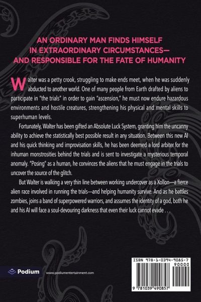 In the first book of this Lovecraftian dark fantasy, an ordinary man finds himself in extraordinary circumstances-and responsible for the fate of humanity. Walter was a petty crook, struggling to make ends meet, when he was suddenly abducted to another world. One of many people from Earth drafted by aliens to participate in "the trials" in order to gain "ascension," he must now endure hazardous environments and hostile creatures, strengthening his physical and mental skills to superhuman levels. Fortunately, Walter has been gifted an Absolute Luck System, granting him the uncanny ability to achieve the statistically best possible result in any situation. Between this new AI and his quick thinking and improvisation skills, he has been deemed a lord arbiter for the inhuman monstrosities behind the trials and is sent to investigate a mysterious temporal anomaly. "Posing" as a human, he convinces the aliens that he must engage in the trials to uncover the source of the glitch. But Walter is walking a very thin line between working undercover as a Xollon-a fierce alien race involved in running the trials-and helping humanity survive. And as he battles zombies, joins a band of superpowered warriors, and assumes the identity of a god, both he and his AI will face a soul-devouring darkness that even their luck cannot evade . . . The first volume of the hit progression-fantasy series-with more than a million views on Royal Road-now available in paperback, ebook, and audiobook!