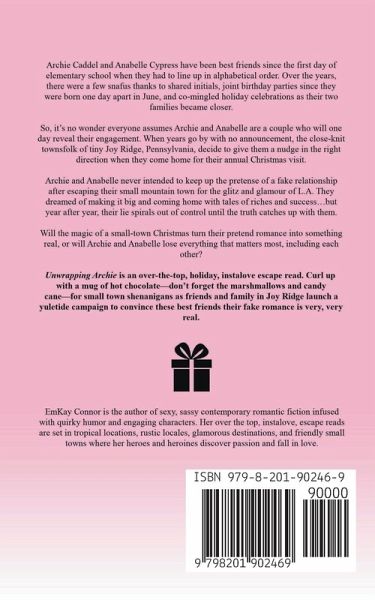 Archie Caddel and Anabelle Cypress have been best friends since the first day of elementary school when they had to line up in alphabetical order. Over the years, there were a few snafus thanks to shared initials, joint birthday parties since they were born one day apart in June, and co-mingled holiday celebrations as their two families became closer. So, it's no wonder everyone assumes Archie and Anabelle are a couple who will one day reveal their engagement. When years go by with no announcement, the close-knit townsfolk of tiny Joy Ridge, Pennsylvania, decide to give them a nudge in the right direction when they come home for their annual Christmas visit. Archie and Anabelle never intended to keep up the pretense of a fake relationship after escaping their small mountain town for the glitz and glamour of L.A. They dreamed of making it big and coming home with tales of riches and success…but year after year, their lie spirals out of control until the truth catches up with them. Will the magic of a small-town Christmas turn their pretend romance into something real, or will Archie and Anabelle lose everything that matters most, including each other? Unwrapping Archie is an over-the-top, holiday, instalove escape read. Curl up with a mug of hot chocolate-don't forget the marshmallows and candy cane-for small town shenanigans as friends and family in Joy Ridge launch a yuletide campaign to convince these best friends their fake romance is very, very real. ***** This story was previously published as part of the Holiday Fake-Out box set (2021).