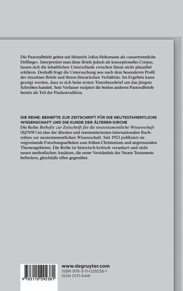 Die inhaltlichen und sprachlichen Gemeinsamkeiten der sogenannten Pastoralbriefe haben die bisherige Forschung zu der Annahme geführt, es handele sich bei diesen drei Briefen um intentional zusammengehörige Schreiben und demnach um "unzertrennliche Drillinge" (Holtzmann). Da auf diese Weise jedoch die ebenfalls vorhandenen Differenzen zwischen den Briefen nicht hinreichend erklärt werden können, wagt die vorliegende Monographie einen neuen Zugang zur Pastoralbriefexegese: Die einzelnen Briefe werden nicht mehr als Teil eines "Corpus Pastorale" verstanden, sondern als Einzelschreiben gewürdigt. Die Untersuchung zentraler Begriffe ermöglicht es, das Profil der einzelnen Schreiben herauszuarbeiten und dadurch das literarische Verhältnis der drei Briefe neu zu bestimmen. Im Ergebnis kann gezeigt werden, dass es sich bei dem ersten Timotheusbrief um den jüngsten der drei Briefe handelt. Dessen Verfasser setzt die beiden anderen Pastoralbriefe bereits als Teil der paulinischen Tradition voraus und rezipiert sie als Element seiner Autorfiktion. Diese Neubestimmung des literarischen Verhältnisses der Pastoralbriefe verändert nicht zuletzt die Voraussetzungen für das Verständnis der Entwicklung der Paulustradition.