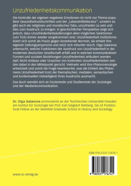 Die Kontrolle der eigenen negativen Emotionen ist nicht nur Thema populärer Gesundheitszeitschriften und der "Lebenshilfeliteratur", sondern es gibt auch ein religiöses und moralisches Tabu, unzufrieden zu sein und dies zum Ausdruck zu bringen. In geschichtlicher Perspektive zeigt sich jedoch, dass Unzufriedenheitsäußerungen allen möglichen Sanktionen zum Trotz immer wieder vorgekommen sind. Unzufriedenheit institutionalisiert sich somit als Praxis gegen bestehende Normen, sie erhebt ihre eigenen Geltungsansprüche und setzt sich mitunter durch. Olga Galanova untersucht, welche Funktionen der Ausdruck von Unzufriedenheit in der modernen deutschen Gesellschaft erfüllt und in welchen kommunikativen Formen und sozialen Beziehungen Unzufriedenheit artikuliert werden darf. Nicht Anlässe oder Ursachen von konkreten Unzufriedenheiten werden dabei in den Mittelpunkt gerückt. Vielmehr wird ihre Phänomenologie entwickelt und somit die Frage beantwortet, was die Einheit des Phänomens Unzufriedenheit trotz der thematischen, medialen, semantischen und kontextuellen Vielseitigkeit ihres Ausdrucks ausmacht.