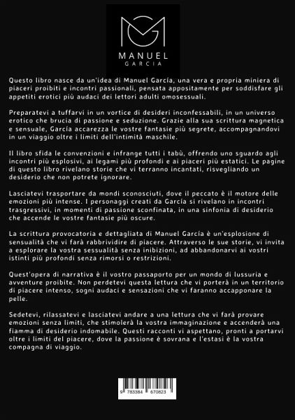 Questo libro nasce da un'idea di Manuel García, una vera e propria miniera di piaceri proibiti e incontri passionali, pensata appositamente per soddisfare gli appetiti erotici più audaci dei lettori adulti omosessuali.Preparatevi a tuffarvi in un vortice di desideri inconfessabili, in un universo erotico che brucia di passione e seduzione. Grazie alla sua scrittura magnetica e sensuale, García accarezza le vostre fantasie più segrete, accompagnandovi in un viaggio oltre i limiti dell'intimità maschile.Il libro sfida le convenzioni e infrange tutti i tabù, offrendo uno sguardo agli incontri più esplosivi, ai legami più profondi e ai piaceri più estatici. Le pagine di questo libro rivelano storie che vi terranno incantati, risvegliando un desiderio che non potrete ignorare.Lasciatevi trasportare da mondi sconosciuti, dove il peccato è il motore delle emozioni più intense. I personaggi creati da García si rivelano in incontri trasgressivi, in momenti di passione sconfinata, in una sinfonia di desiderio che accende le vostre fantasie più oscure.La scrittura provocatoria e dettagliata di Manuel García è un'esplosione di sensualità che vi farà rabbrividire di piacere. Attraverso le sue storie, vi invita a esplorare la vostra sessualità senza inibizioni, ad abbandonarvi ai vostri istinti più profondi senza rimorsi o restrizioni.Quest'opera di narrativa è il vostro passaporto per un mondo di lussuria e avventure proibite. Non perdetevi questa lettura che vi porterà in un territorio di piacere intenso, sogni audaci e sensazioni che vi faranno accapponare la pelle.Sedetevi, rilassatevi e lasciatevi andare a una lettura che vi farà provare emozioni senza limiti, che stimolerà la vostra immaginazione e accenderà una fiamma di desiderio indomabile. Questi racconti vi aspettano, pronti a portarvi oltre i limiti del piacere, dove la passione è sovrana e l'estasi è la vostra compagna di viaggio.