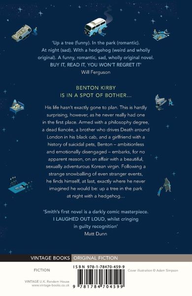 Benton Kirby is in a spot of bother... His life hasn't exactly gone to plan. This is hardly surprising however as he never really had one in the first place. Armed with a philosophy degree a dead fianc a brother who drives Death around London in his black cab and a girlfriend with a history of suicidal pets Benton - ambitionless and emotionally disengaged - embarks for no apparent reason on an affair with a beautiful sexually adventurous Korean virgin. Following a strange snowballing of even stranger events he finds himself at last exactly not where he ever imagined he would be up a tree at night in the park with a hedgehog...