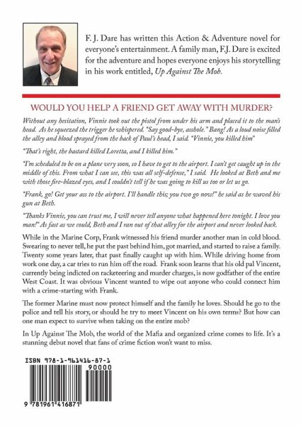 WOULD YOU HELP A FRIEND GET AWAY WITH MURDER? Without any hesitation, Vinnie took out the pistol from under his arm and placed it to the man's head. As he squeezed the trigger he whispered. "Say good-bye, asshole." Bang! As a loud noise filled the alley and blood sprayed from the back of Paul's head, I said. "Vinnie, you killed him" "That's right, the bastard killed Loretta, and I killed him." "I'm scheduled to be on a plane very soon, so I have to get to the airport. I can't get caught up in the middle of this. From what I can see, this was all self-defense," I said. He looked at Beth and me with those fire-blazed eyes, and I couldn't tell if he was going to kill us too or let us go. "Frank, go! Get your ass to the airport. I'll handle this; you two go now!" he said as he waved his gun at Beth. "Thanks Vinnie, you can trust me, I will never tell anyone what happened here tonight. I love you man!" As fast as we could, Beth and I ran out of that alley for the airport and never looked back. While in the Marine Corp, Frank witnessed his friend murder another man in cold blood. Swearing to never tell, he put the past behind him, got married, and started to raise a family. Twenty some years later, that past finally caught up with him. While driving home from work one day, a car tries to run him off the road. Frank soon learns that his old pal Vincent, currently being indicted on racketeering and murder charges, is now godfather of the entire West Coast. It was obvious Vincent wanted to wipe out anyone who could connect him with a crime-starting with Frank. The former Marine must now protect himself and the family he loves. Should he go to the police and tell his story, or should he try to meet Vincent on his own terms? But how can one man expect to survive when taking on the entire mob? In Up Against The Mob, the world of the Mafia and organized crime comes to life. It's a stunning debut novel that fans of crime fiction won't want to miss.