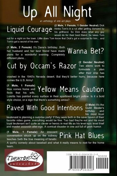 A collection of one-act plays by rising Los Angeles playwright Gregory Crafts. Developed from only a short writing prompt, these plays were written, rehearsed and put up in front of a live audience within in a single 24 hour window. Liquid Courage: A comedy about looking for love in all the wrong places. Wanna Bet?: It's Dana's birthday. Both her husband and her best friend have made plans for a wonderful evening. Completely different plans... Cut by Occam's Razor: Two aliens work to formulate a plan after their ship has crashed in the 1940's Nevada desert. But they'd better hurry, because here comes the US Army! Yellow Means Caution: Max comes home and finds that his wife, Loretta has painted every surface in their apartment bright yellow. Is it a bold style choice, or a sign that there's something amiss? Paved With Good Intentions: A comical disaster in one act full of geek humor. Pink Hat Blues: A quirky comedy about baseball and what it really means to root for the home team.