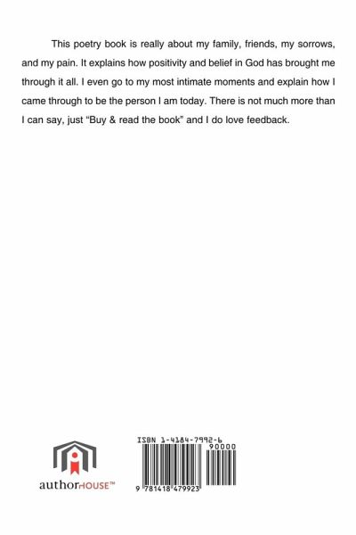 This poetry book is really about my family, friends, my sorrows, and my pain. It explains how positively and belief in God has brought me though it all. I even go to my most intimate moments and explain how I came through to be the person I am today. There is not much more than I can say, just "Buy & read the book" and I do love feedback.