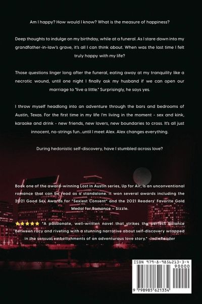 Am I happy? How would I know? What is the measure of happiness? Deep thoughts to indulge on my birthday, while at a funeral. As I stare down into my grandfather-in-law's grave, it's all I can think about. When was the last time I felt truly happy with my life? Those questions linger long after the funeral, eating away at my tranquility like a necrotic wound, until one night I finally ask my husband if we can open our marriage to "live a little." Surprisingly, he says yes. I throw myself headlong into an adventure through the bars and bedrooms of Austin, Texas. For the first time in my life I'm living in the moment - sex and kink, karaoke and drink - new friends, new lovers, new boundaries to cross. It's all just innocent, no-strings fun...until I meet Alex. Alex changes everything. During hedonistic self-discovery, have I stumbled across love? Book one of the award-winning Lost in Austin series, Up for Air, is an unconventional romance that can be read as a standalone. It won several awards including the 2021 Good Sex Awards for "Sexiest Consent" and the 2021 Readers' Favorite Gold Medal for Romance - Sizzle.