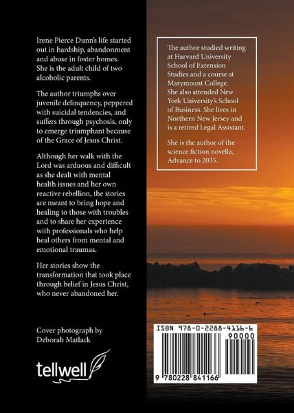 Irene Pierce Dunn's life started out in hardship, abandonment and abuse in foster homes. She is the adult child of two alcoholic parents. The author triumphs over juvenile delinquency, peppered with suicidal tendencies, and suffers through psychosis, only to emerge triumphant because of the Grace of Jesus Christ. Although her walk with the Lord was arduous and difficult as she dealt with mental health issues and her own reactive rebellion, the stories are meant to bring hope and healing to those with troubles and to share her experience with professionals who help heal others from mental and emotional traumas. Her stories show the transformation that took place through belief in Jesus Christ, who never abandoned her.