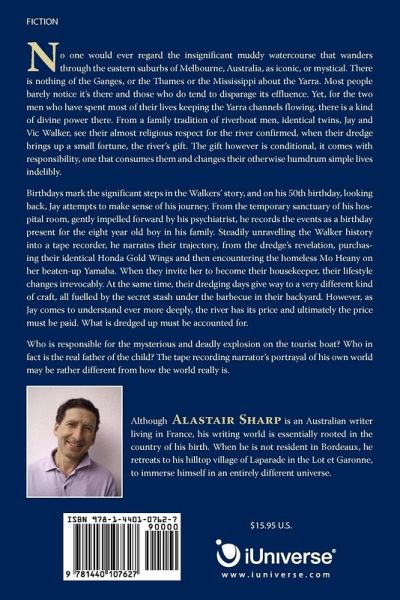 No one would ever regard the insignificant muddy watercourse that wanders through the eastern suburbs of Melbourne, Australia, as iconic, or mystical. There is nothing of the Ganges, or the Thames or the Mississippi about the Yarra. Most people barely notice it's there and those who do tend to disparage its effluence. Yet, for the two men who have spent most of their lives keeping the Yarra channels flowing, there is a kind of divine power there. From a family tradition of riverboat men, identical twins, Jay and Vic Walker, see their almost religious respect for the river confirmed, when their dredge brings up a small fortune, the river's gift. The gift however is conditional, it comes with responsibility, one that consumes them and changes their otherwise humdrum simple lives indelibly. Birthdays mark the significant steps in the Walkers' story, and on his 50th birthday, looking back, Jay attempts to make sense of his journey. From the temporary sanctuary of his hospital room, gently impelled forward by his psychiatrist, he records the events as a birthday present for the eight year old boy in his family. Steadily unravelling the Walker history into a tape recorder, he narrates their trajectory, from the dredge's revelation, purchasing their identical Honda Gold Wings and then encountering the homeless Mo Heany on her beaten-up Yamaha. When they invite her to become their housekeeper, their lifestyle changes irrevocably. At the same time, their dredging days give way to a very different kind of craft, all fuelled by the secret stash under the barbecue in their backyard. However, as Jay comes to understand ever more deeply, the river has its price and ultimately the price must be paid. What is dredged up must be accounted for. Who is responsible for the mysterious and deadly explosion on the tourist boat? Who in fact is the real father of the child? The tape recording narrator's portrayal of his own world may be rather different from how the world really is.