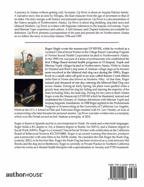 Roger Slagle wrote the manuscript UP RIVER, while he worked as a Licensed Clinical Social Worker in the Village Based Counseling Program of Norton Sound Health Corporation located in Northwestern Alaska. In the 1990's he was part of a team of professionals who established the first Village Based mental health programs in 15 Inupiat, Yupik and Siberian Yupik villages located in Northwestern Alaska. While in Alaska he Mushed and Bred a dog team of Alaskan village dogs as he became more involved in the Iditerod sled dog race during the 1990's. Roger lived in a small cabin off grid in an area called Banner Creek fifteen miles East of Nome also known as Mushers Alley. At that time, Roger trained and dreamed of one day entering the Iditerod Sled Dog race across Alaska. During an Early Spring, his plans were quelled when a grizzly bear attacked his dog lot, killing and injuring the majority of his team including Miko, his lead dog. During his ten years in Bush Alaska Roger wrote the Manuscript UP RIVER which he illustrated, indexed and established the Glossary of Alaskan definitions with Siberian Yupik and Inupiaq linguistic translations. In 1998 Roger applied to the Professionals Program in Screenwriting at the University of California Los Angeles. While at the UCLA School of Film and Television Roger studied with Dr. Lew Hunter, an Icon of screenwriting who later became his personal mentor. Up River was later written into a screenplay which won the Denali award as best Alaskan screenplay of 2012. Roger is fluent in Spanish and he is conversational in Hindi. He reads and writes both languages. Roger holds a BA degree in Art, a Masters degree in Studio Art (MFA), and a Masters degree in Social Work (MSW). Roger is a Licensed Clinical Social Worker with certification at the California Board of Behavioral Sciences #LCSW10885. Roger is an award winning film director, producer and screenwriter with nine films to his IMDb credits. He considers the film Ruger the Rude Dog, (comedy 2021), to be his best film. Ruger the Rude Dog has been reviewed as a cross between Mel Brooks and the dog movie Beethoven. Roger is currently in Private Practice in Northern California where he works as a Mental Health therapist with a specialization in Anxiety and PTSD treatment.