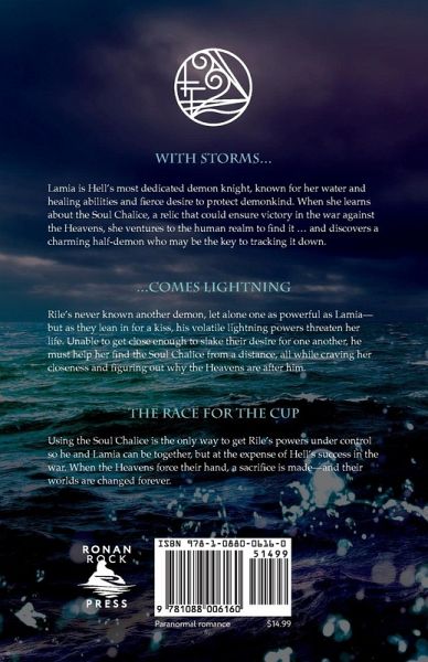 With storms... Lamia is Hell's most dedicated demon knight, known for her water and healing abilities and fierce desire to protect demonkind. When she learns about the Soul Chalice, a relic that could ensure victory in the war against the Heavens, she ventures to the human realm to find it ... and discovers a charming half-demon who may be the key to tracking it down. ...comes lightning. Rile's never known another demon, let alone one as powerful as Lamia-but as they lean in for a kiss, his volatile lightning powers threaten her life. Unable to get close enough to slake their desire for one another, he must help her find the Soul Chalice from a distance, all while craving her closeness and figuring out why the Heavens are after him. The race for the cup Using the Soul Chalice is the only way to get Rile's powers under control so he and Lamia can be together, but at the expense of Hell's success in the war. When the Heavens force their hand, a sacrifice is made-and their worlds are changed forever.