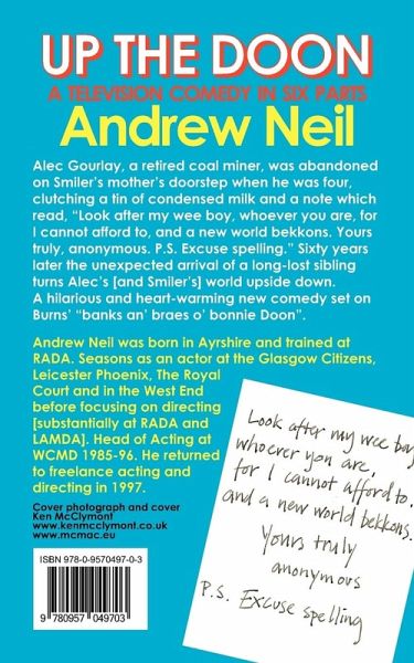 Up the Doon is A hilarious and heart-warming new comedy written for television and set on Burns' "banks an' braes o' bonnie Doon". It features Alec Gourlay, a retired coal miner, who was abandoned on Smiler's mother's doorstep when he was four, clutching a tin of condensed milk and a note which read, "Look after my wee boy, whoever you are, for I cannot afford to, and a new world bekkons. Yours truly, anonymous. P.S. Excuse spelling." Sixty years later the unexpected arrival of a long-lost sibling turns Alec's [and Smiler's] world upside down.