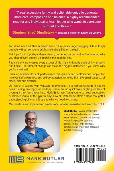 You don't need another self-help book full of pious finger-wagging. Life is tough enough without someone bright and shiny piling on the guilt. But if you're in a post-pandemic slump, bordering on burnout and wondering why you should even bother, Up Yours! is the book for you. Radical self-care crosses every aspect of life. It's mind, body and spirit - at work and home. The smallest change can make the biggest difference if you know why you're making it. Pursuing sustainable peak performance through a better, healthier and happier life involves self-awareness and self-compassion, far more than the usual suspects of sleep, diet and exercise. Up Yours! is packed with valuable information. It's a radical recharge if you've been running on empty for too long. There are no quick fixes or glib promises of overnight transformations here. Mark Butler won't nag you to eat your vegetables or implore you to hit the gym six days a week. Instead, he offers a clear, thoughtful understanding of what ails us and why we need to change. Mark writes as an experienced professional who has seen it all and lived much of it.