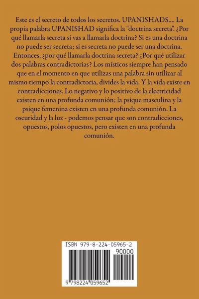 Este es el secreto de todos los secretos. UPANISHADS.... La propia palabra UPANISHAD significa la "doctrina secreta". ¿Por qué llamarla secreta si vas a llamarla doctrina? Si es una doctrina no puede ser secreta; si es secreta no puede ser una doctrina. Entonces, ¿por qué llamarla doctrina secreta? ¿Por qué utilizar dos palabras contradictorias? Los místicos siempre han pensado que en el momento en que utilizas una palabra sin utilizar al mismo tiempo la contradictoria, divides la vida. Y la vida existe en contradicciones. Lo negativo y lo positivo de la electricidad existen en una profunda comunión; la psique masculina y la psique femenina existen en una profunda comunión. La oscuridad y la luz - podemos pensar que son contradicciones, opuestos, polos opuestos, pero existen en una profunda comunión.