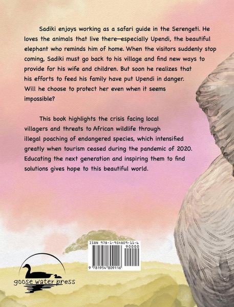 Sadiki enjoys working as a safari guide in the Serengeti. He loves the animals that live there- especially Upendi, the beautiful elephant who reminds him of home. When the visitors suddenly stop coming, Sadiki must go back to his village and find new ways to provide for his wife and children. But soon he realizes that his efforts to feed his family have put Upendi in danger. Will he choose to protect her even when it seems impossible? This book highlights the crisis facing local villagers and threats to African wildlife through illegal poaching of endangered species, which intensified greatly when tourism ceased during the pandemic of 2020. Educating the next generation and inspiring them to find solutions gives hope to this beautiful world.