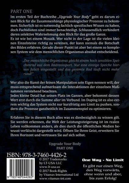 PART ONEIm ersten Teil der Buchreihe Upgrade Your Body geht es darum, einen Blick für die Zusammenhänge physiologischer Prozesse zu bekommen. Sicherlich ist es notwendig fachlich spezifisches Wissen zu haben, doch Fachidioten sind immer benachteiligt. Schlussendlich verhindert deren selektive Wahrnehmung den Blick für das große Ganze.Es ist wie bei einem Mosaik. Wer nicht in der Lage ist, die vielen kleinen Einzelsteine richtig zu vereinen, der kann niemals die Botschaft des Bildes erfahren. Gerade dieser Punkt ist aber bei einem so komplexen System wie dem menschlichen Organismus absolut entscheidend.Der menschliche Organismus gleicht einem hoch sensiblen Speichenrad aus dem Radrennsport. Nur eine einzige Speiche hiervon falsch eingestellt und das gesamte Rad läuft nicht mehr rund!Wer also die Kunst der feinen Manipulation sein Eigen nennen will, der muss entsprechend aufmerksam die Interaktionen der einzelnen Maßnahmen verstehend beachten.Jedes kleine Detail hat seinen Platz imGanzen, aber bekommt dessen Wert erst durch die Summe aller im Verbund. Im Doping ist es also extrem wichtig das System nicht nur kurzfristig ans Limit zu pushen, sondern die Prozesse ganzheitlich im Zusammenspiel zu optimieren.Erfahren Sie in diesem Buch alles, was es diesbezüglich zu wissen gilt. Sie werden erkennen, die Welt der Leistungssteigerung ist im realen Leben vollkommen anders, als dies durch die öffentlichen Medien bewusst verfälscht dargestellt wird. Öffnen Sie Ihren Geist, erweitern Sie Ihren Horizont und vertrauen Sie auf sich selbst.Upgrade Your BodyPART ONE