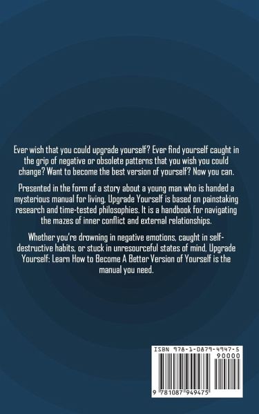 Ever wish that you could upgrade yourself? Ever find yourself caught in the grip of negative or obsolete patterns that you wish you could change? Want to become the best version of yourself? Now you can. Presented in the form of a story about a young man who is handed a mysterious manual for living, Upgrade Yourself is based on painstaking research and time-tested philosophies. It is a handbook for navigating the mazes of inner conflict and external relationships. Upgrade Yourself will teach you: How research into neuroplasticity and psychology proves that people can change, debunking that myth that "You can't teach an old dog new tricks" How the conflict between body and mind and between the conscious and unconscious minds can be resolved within the individual self How people are trapped in the bubbles of their subjective experiences, and how to free yourself from the trap of shortsightedness The true nature of emotions and how to get a handle of your negative feelings How to apply the wisdom of the ancient Stoics and discover what it means to live a "good life" How people can use emotional granularity to construct finer-grained emotional experiences How to recategorize your feelings and emotions to help master our physical responses to them How to develop the farsighted perspective How to use a positive mindset to achieve success in your relationships, in your creative pursuits, and your career How to use modalities and submodalities to alter your perceptions of painful memories and crushing anxieties How to change your mental and emotional state from a unresourceful state to a resourceful one. How to form new strategies for mastering your emotions and mindset to overcome any obstacle The difference between the pleasant life, the good life, and the meaningful life The 6 character virtues and the 24 character strengths of positive psychology Whether you're drowning in negative emotions, caught in self-destructive habits, or stuck in unresourceful states of mind, Upgrade Yourself: Learn How to Become A Better Version of Yourself is the manual you need.