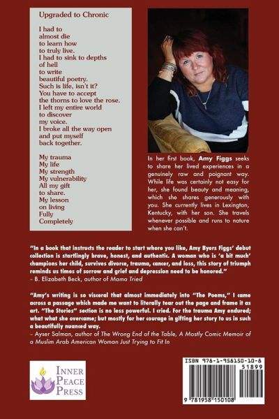 Upgraded to Chronic I had to almost die to learn how to truly live. I had to sink to depths of hell to write beautiful poetry. Such is life, isn't it? You have to accept the thorns to love the rose. I left my entire world to discover my voice. I broke all the way open and put myself back together. My trauma My life My strength My vulnerability All my gift to share. My lesson on living Fully Completely In her first book, Amy Figgs seeks to share her lived experiences in a genuinely raw and poignant way. While life was certainly not easy for her, she found beauty and meaning, which she shares generously with you. She currently lives in Lexington, Kentucky, with her son. She travels whenever possible and runs to nature when she can't. "In a book that instructs the reader to start where you like, Amy Byers Figgs' debut collection is startlingly brave, honest, and authentic. A woman who is 'a bit much' champions her child, survives divorce, trauma, cancer, and loss, this story of triumph reminds us times of sorrow and grief and depression need to be honored." ~ B. Elizabeth Beck, author of Mama Tried¿"Amy's writing is so visceral that almost immediately into "The Poems," I came across a passage which made me want to literally tear out the page and frame it as art. "The Stories" section is no less powerful. I cried. For the trauma Amy endured; what what she overcame; but mostly for her courage in gifting her story to us in such a beautifully nuanced way.~ Ayser Salman, author of The Wrong End of the Table, A Mostly Comic Memoir of a Muslim Arab American Woman Just Trying to Fit In