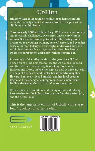 Hillary Wilkes is the unlikely middle-aged heroine in this romantic comedy about a woman whose life is a precarious climb on an uphill battle. Toronto, early 2000's. Hillary "Lary" Wilkes is an emotionally and physically challenged, Over Fifty, once a very vibrant woman. She's at the lowest point of her life, having lost her dream job to a younger woman, her self-esteem, and even her sense of humor. Hillary is overweight, underloved and, as a result, feels unlovable - except perhaps from her family, whose encouragement keeps her from bottoming out. But enough of the self-pity: this is the year she will find herself an exciting new career, lose the 20 pounds for good and find the perfect mate. Quit smoking. Sort out her finances and ... well, maybe she can't do it all at once. But with the help of her best friend Becks, her wonderful neighbor Howard, her lovely niece Pumpkin and her loyal brother Roger, and the cheery encouragement from a new friend Dudley, she knows she can do it. One step at a time. With a hitch here and there and plenty of fun and hilarity, Lary reaches for the hilltop. But can she find the perfect job, and the perfect man? This is the large print edition of UpHill, with a larger font / typeface for easier reading.