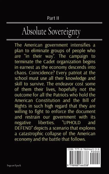 The American government intensifies a plan to eliminate groups of people who are "in their way". The campaign to terminate the Cadet organization begins in earnest just as the economy descended into chaos. Coincidence? Kaiden and every patriot at the school must use all their knowledge and skill to survive. The endeavor cost some of them their lives, hopefully not the outcome for all the Patriots who hold the American Constitution and the Bill of Rights in such high regard that they are willing to fight to enforce the document and restrain our government with its negative liberties. 'UPHOLD and DEFEND': Absolute Sovereignty, depicts a scenario that explores an economic collapse in America. This is a work of fiction but these are possible events that could transpire if 'We The People' are ever forced to UPHOLD and DEFEND the American Constitution when our politicians have failed to do so. Consider the topics this book brings up- and prepare.